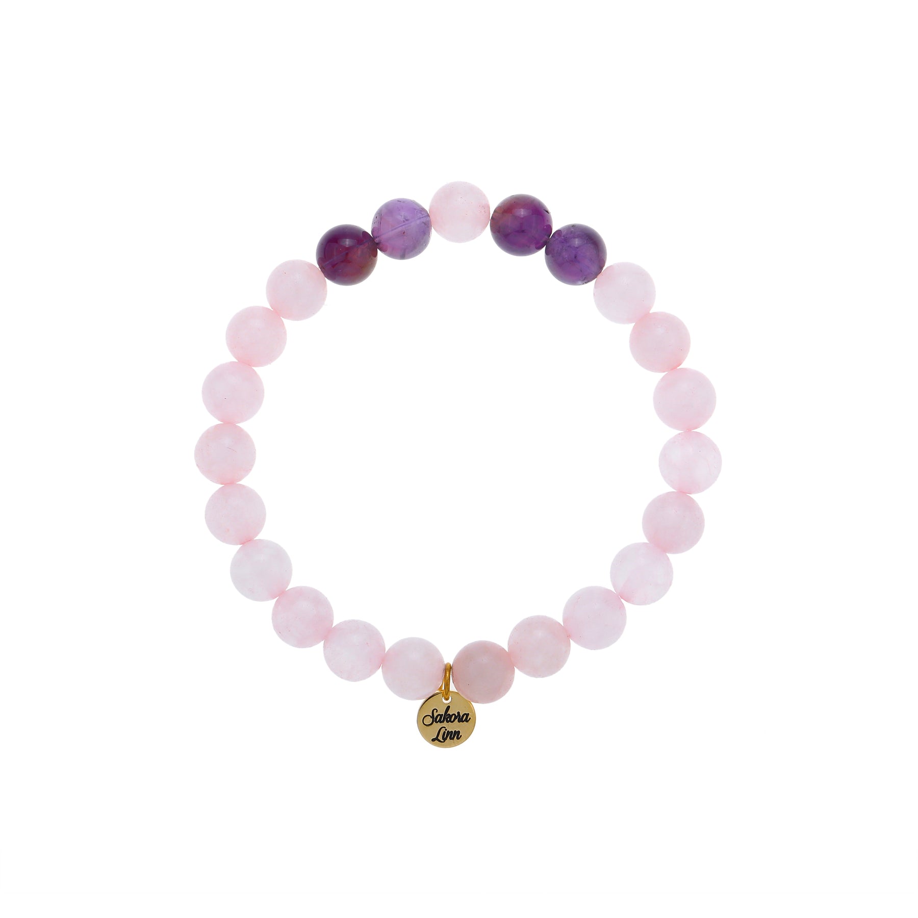 Materials: 8mm Rose Quartz, 8mm Amethyst, Clear Stretch Cord, 18k Gold Plated Brass Logo Tag
