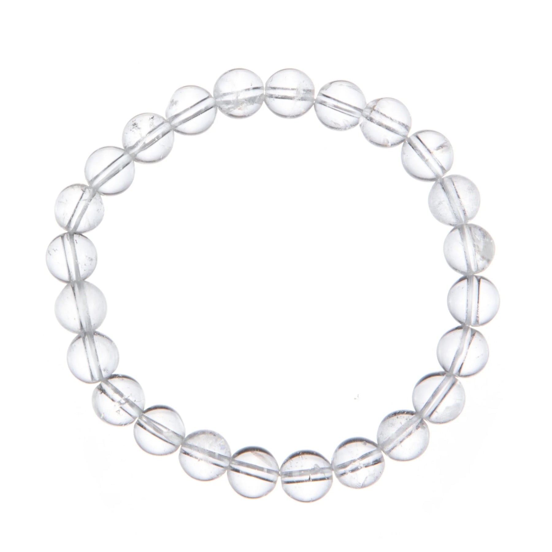 A close-up of a stretch bracelet made with 8mm round clear quartz beads connected with a clear stretch cord, on a white background.