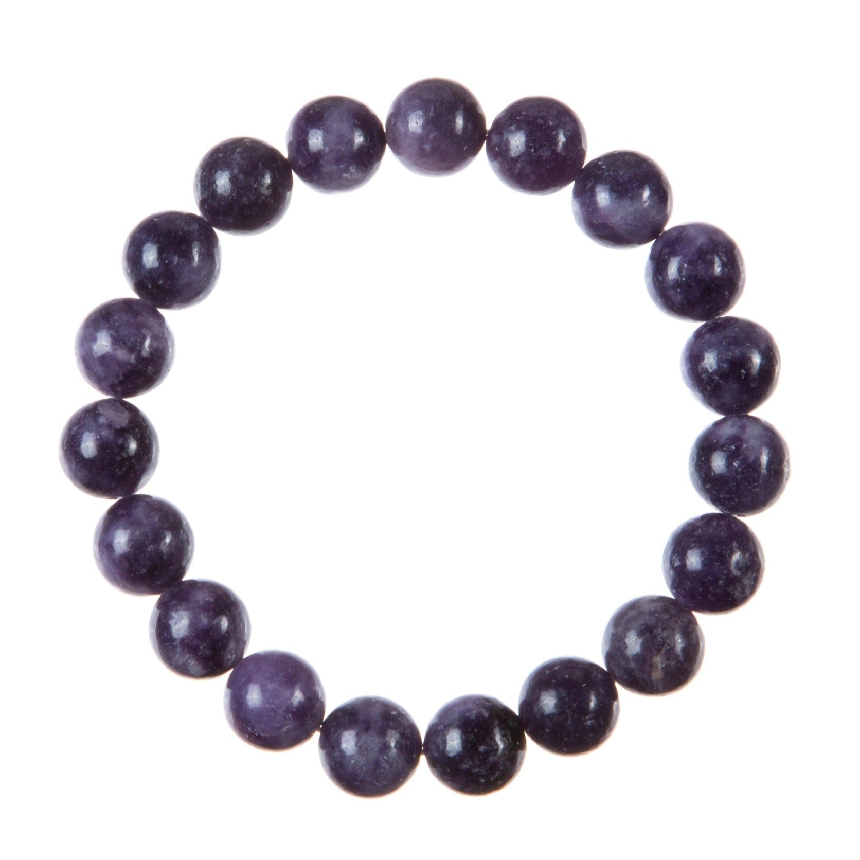 Close-up of a stretch style bracelet made with round 10mm polished purple phosohosiderite beads strung on a clear stretch cord and displayed on a white background.