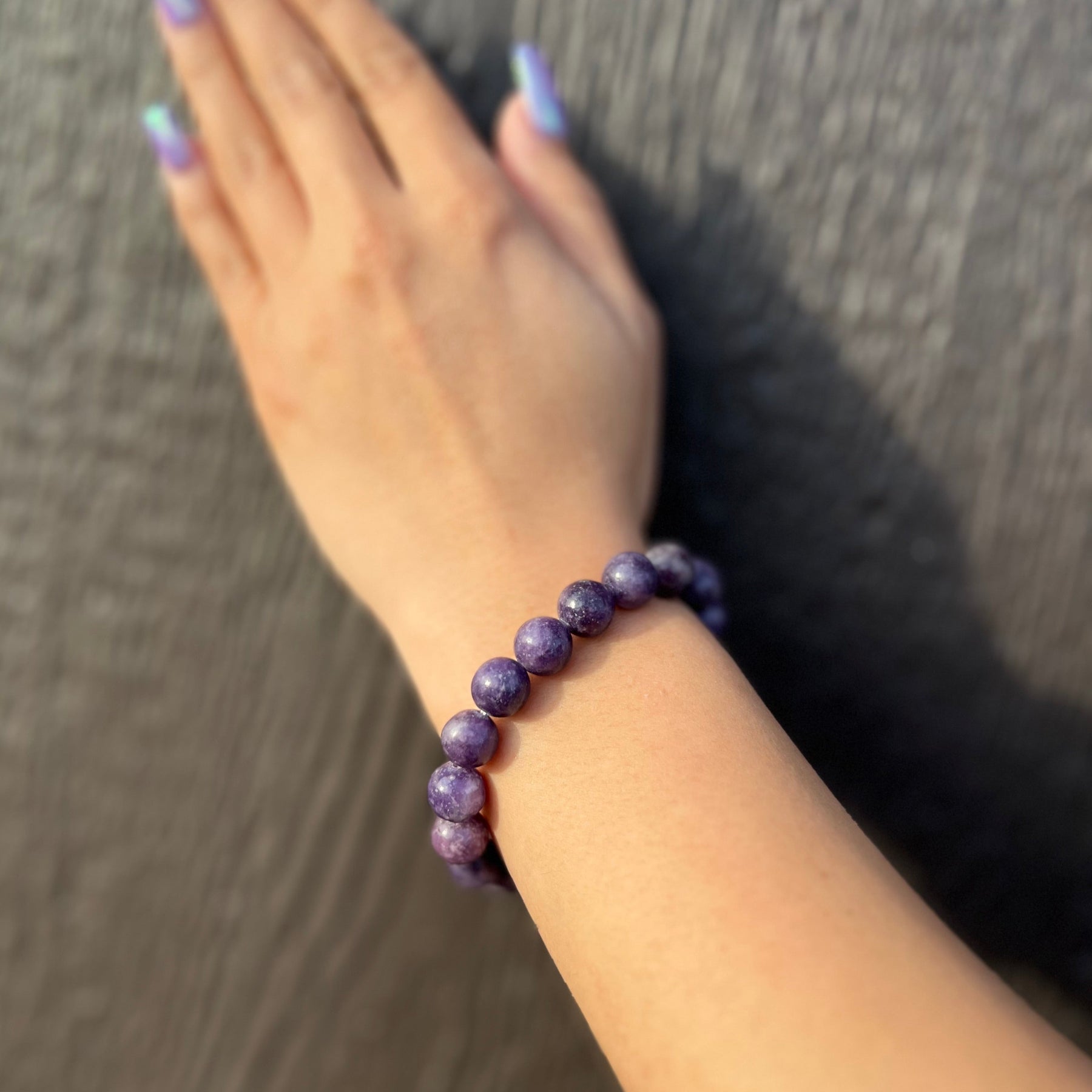 Close-up of a woman's wrist wearing a stretch style bracelet made with round 10mm polished purple phosohosiderite beads strung on a clear stretch cord and displayed on a gray blurred wood background.