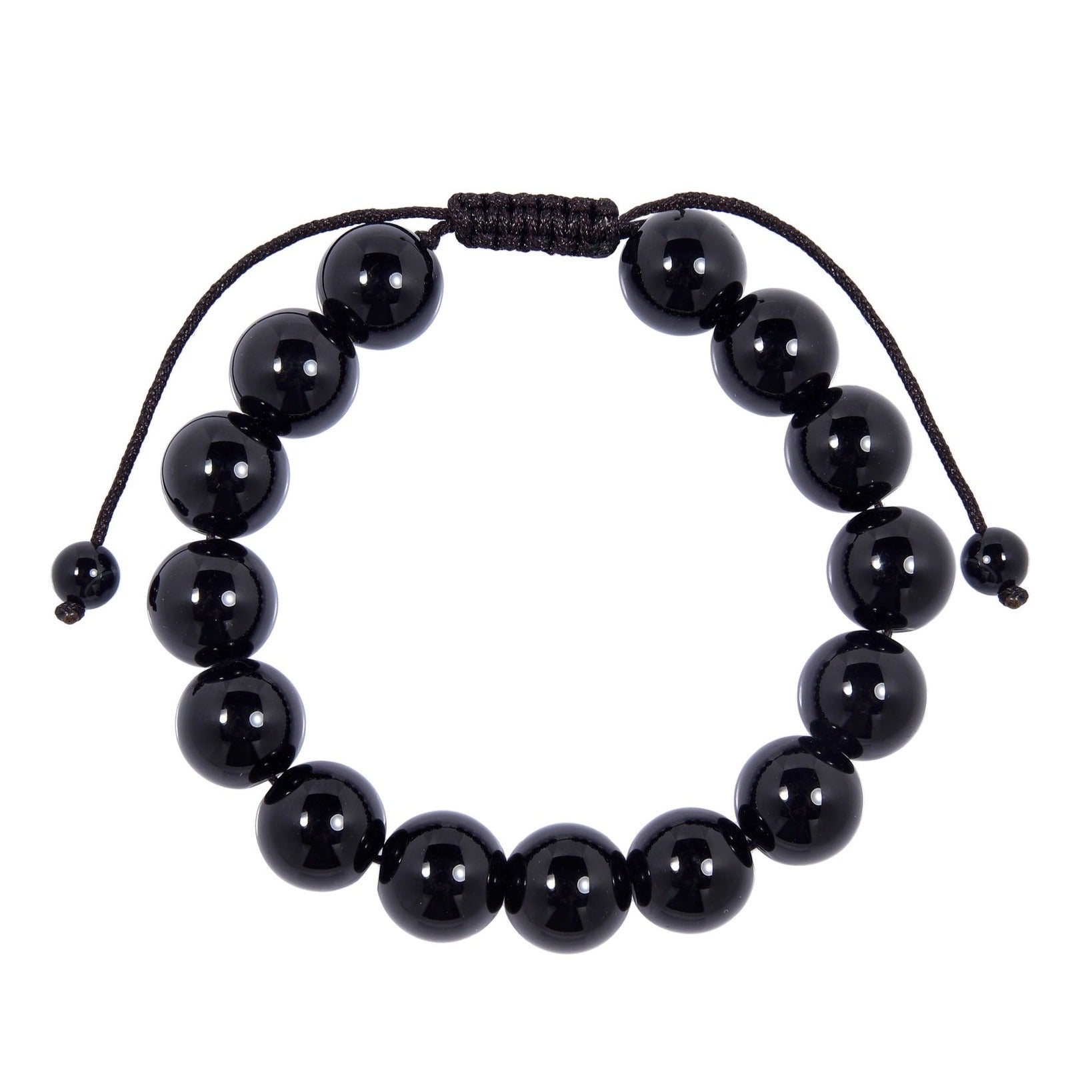 Close-up of a glossy black onyx bracelet made with polished 12mm round black beads and a dark brown pull tie style cord closure, displayed on a white background.