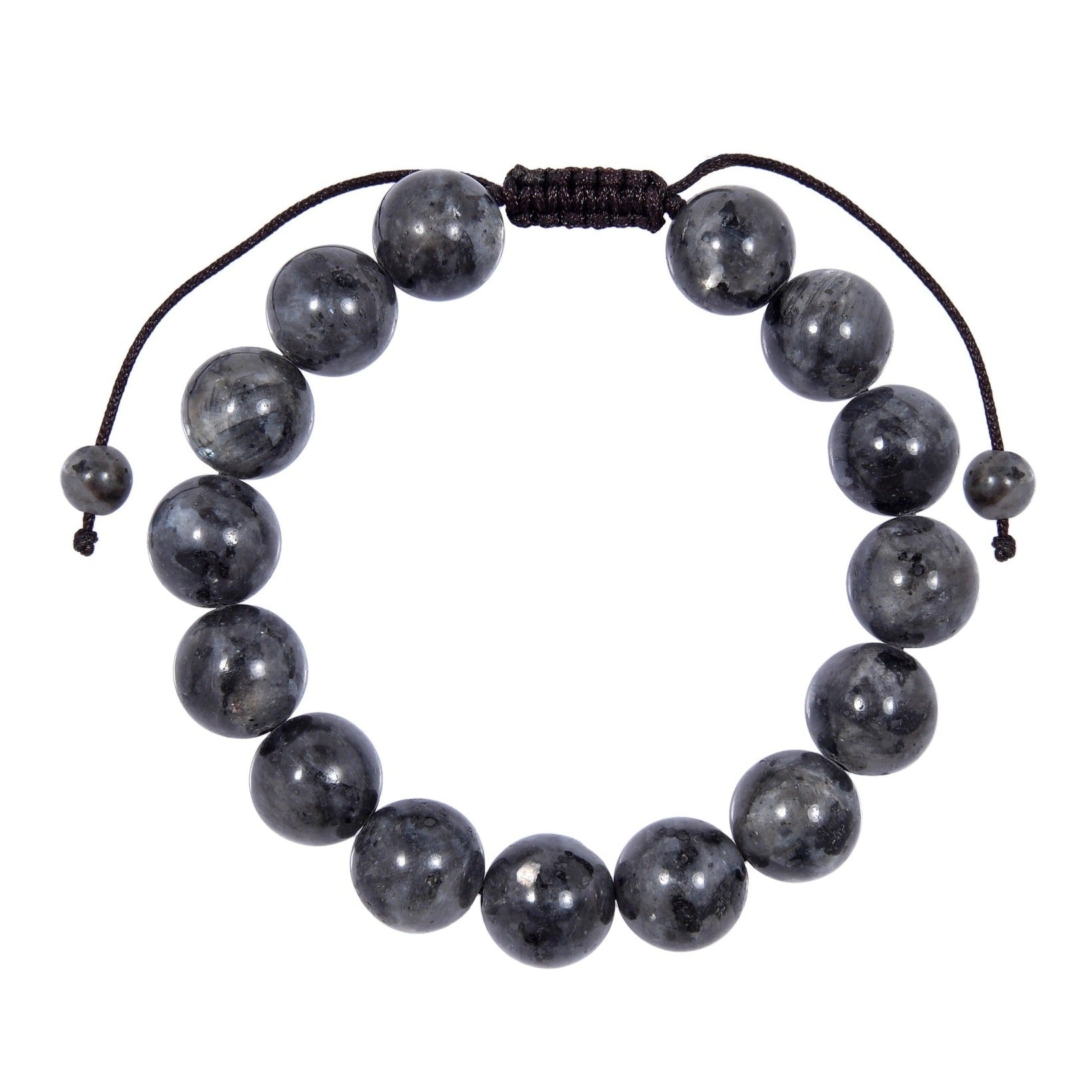 Materials: 12mm, 8mm, or 6mm Black Labradorite Stone Beads, Polyester Pull Tie Cord