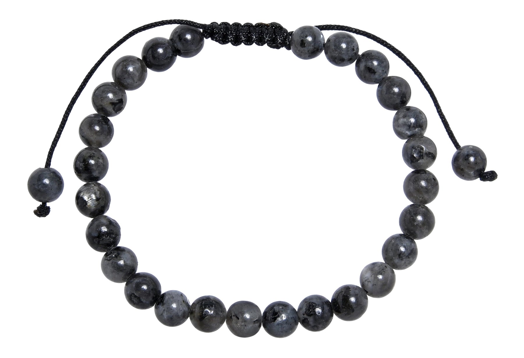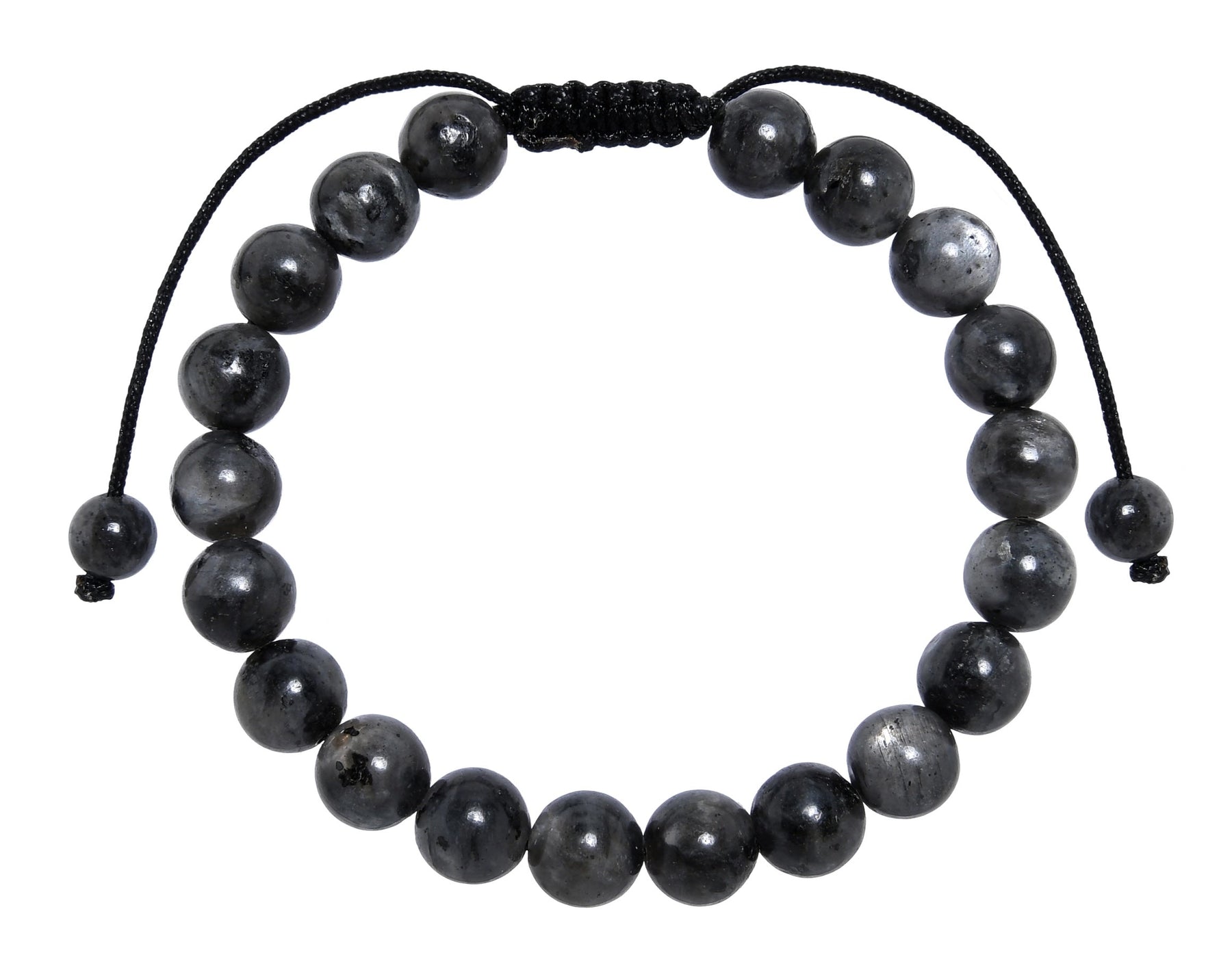 Materials: 12mm, 8mm, or 6mm Black Labradorite Stone Beads, Polyester Pull Tie Cord